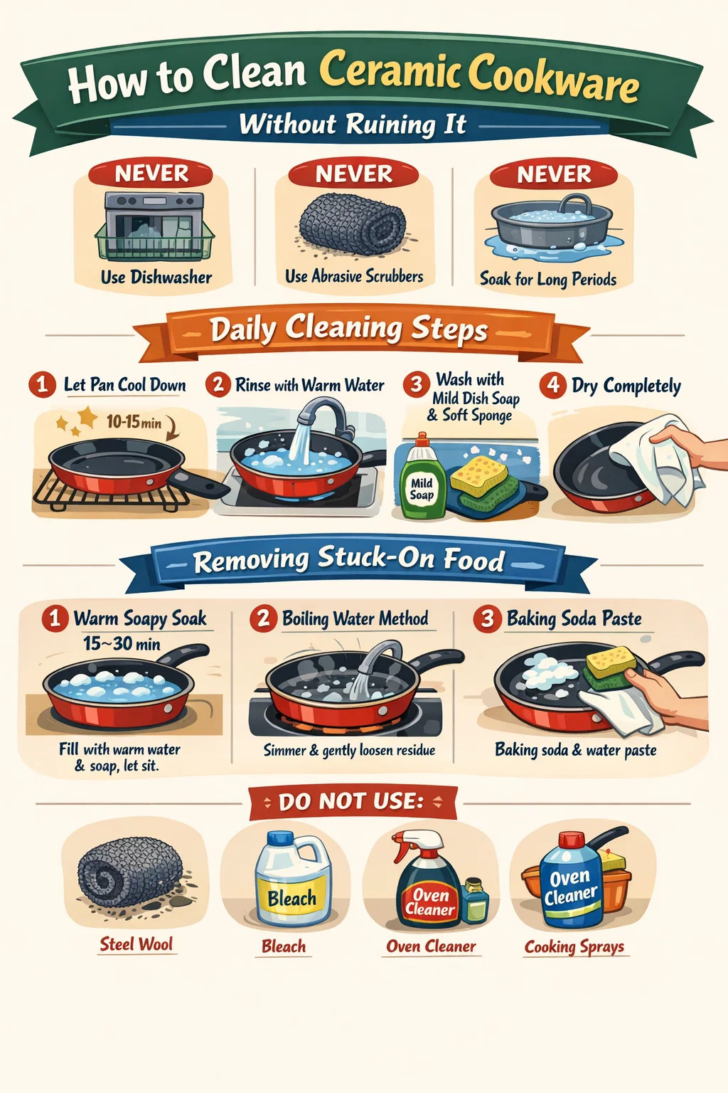 Les ustensiles de cuisine en céramique doivent être nettoyés avec de l'eau tiède, quelques gouttes de savon à vaisselle et une éponge ou un chiffon doux, immédiatement après refroidissement. Ne le mettez jamais au lave-vaisselle, n’utilisez jamais de brosses abrasives et ne le laissez jamais tremper pendant de longues périodes. Ces trois règles à elles seules prolongeront considérablement la durée de vie de votre batterie de cuisine antiadhésive en céramique.