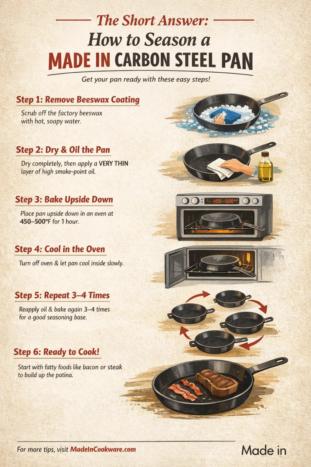 Pour assaisonner une poêle en acier au carbone Fabriqué en, vous lavez le revêtement protecteur de cire d'abeille avec lequel elle est livrée, la séchez complètement, appliquez une très fine couche d'huile à point de fumée élevé sur toute la surface et chauffez-la dans un four à 450-500°F jusqu'à ce que l'huile polymérise en une couche dure et lisse. Répétez ce processus 3 à 4 fois avant votre premier cuisinier. C'est l'essentiel. Tout le reste – les huiles spécifiques, les nuances de température du four, la méthode de cuisson, les soins à long terme – n'est qu'un raffinement au-dessus de ce cadre de base.