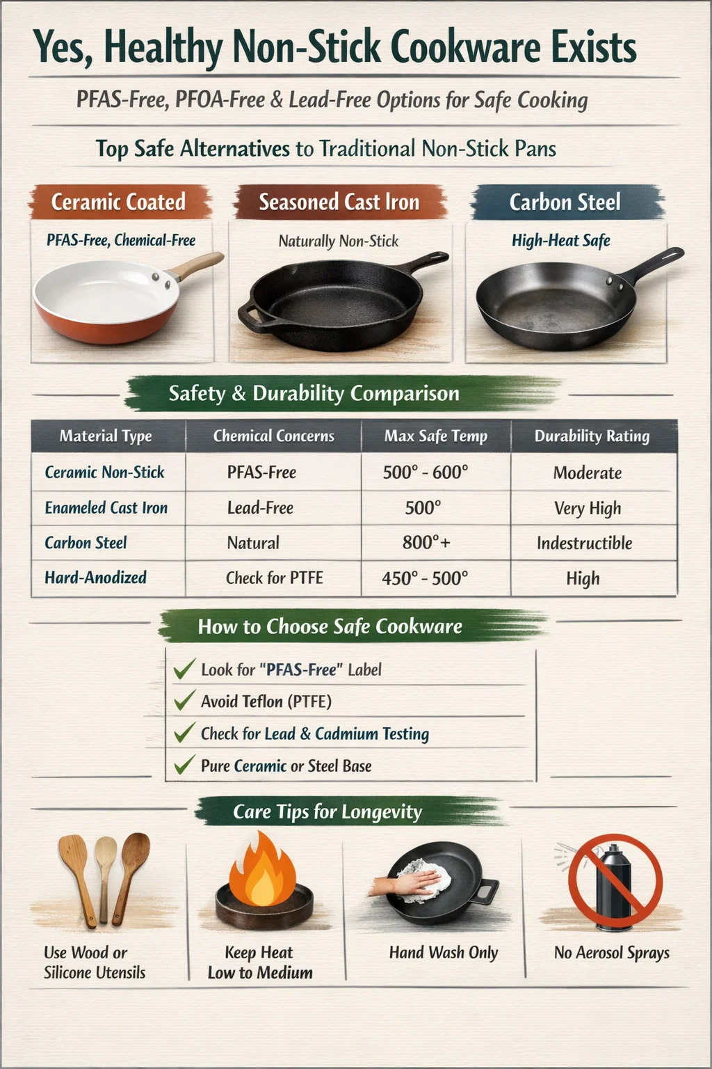 - Éviter "Téflon" marque : Bien que le téflon moderne soit sans PFOA, il utilise toujours du PTFE, qui peut dégazer à des températures supérieures à 500°F.