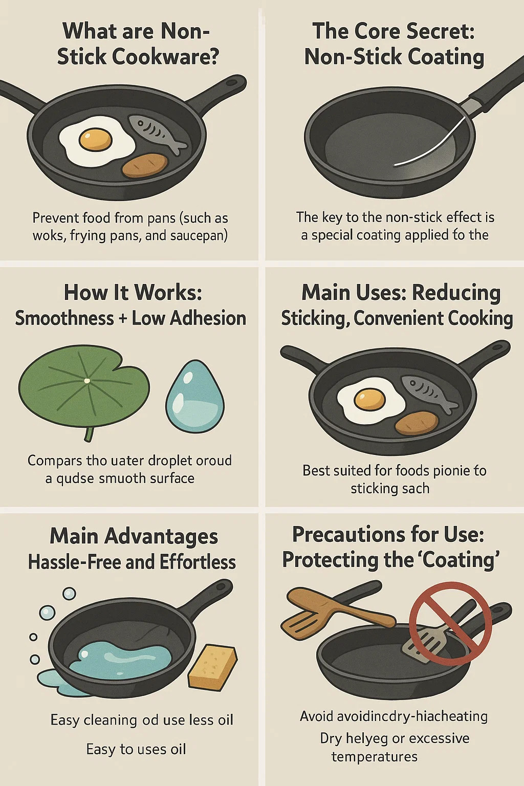 En termes simples, il s'agit de casseroles et de poêles (comme les woks, les poêles et les casseroles) dont la surface intérieure a été spécialement traitée pour éviter que les aliments ne collent au fond pendant la cuisson. Lorsque vous faites sauter, frire des œufs ou du poisson, les aliments ne collent pas facilement au fond de la poêle.
