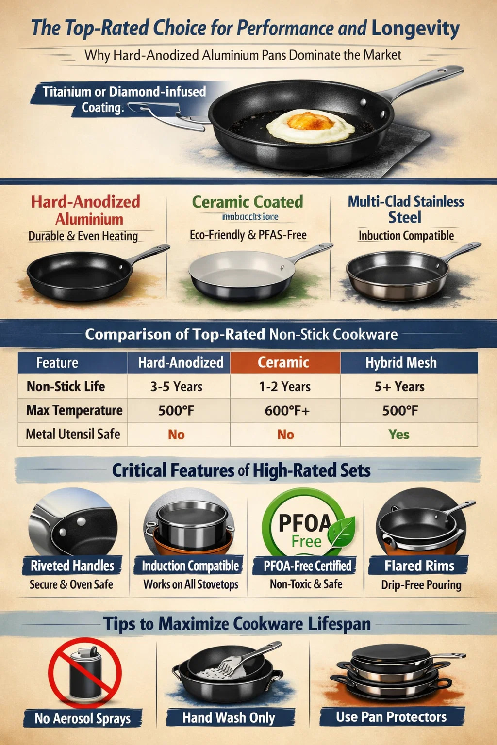 En recherchant le meilleur batterie de cuisine antiadhésive , les notes sont généralement divisées en trois catégories matérielles distinctes. Les comprendre vous aide à sélectionner un ensemble qui correspond à vos préférences spécifiques en matière de chaleur de cuisson et à vos habitudes d'entretien.